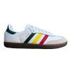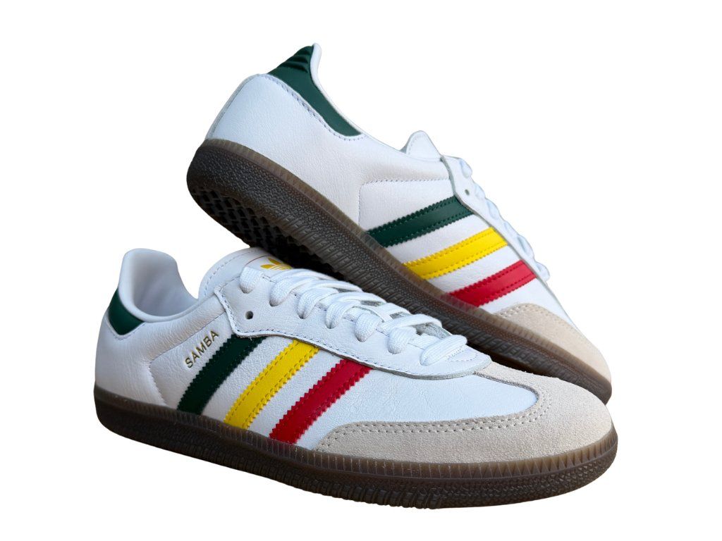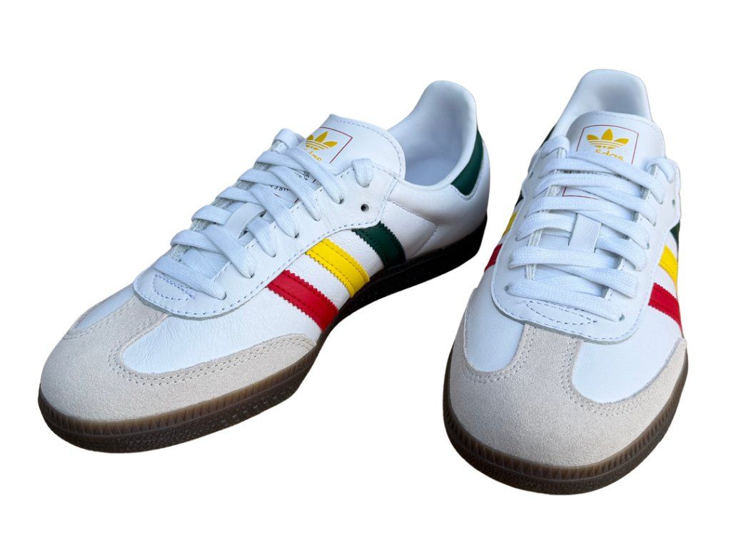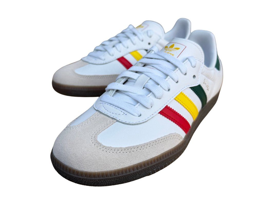 Ikonické tenisky adidas Samba OG v bílé barvě s tradičními pruhy v rasta stylu, tedy zelená, červená a žlutá. Retro design, který spojuje klasiku s moderním streetwearem s rasta detaily. Skvělá volba pro každodenní nošení, která decentně doplní jakýkoliv outfit.