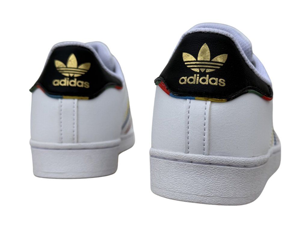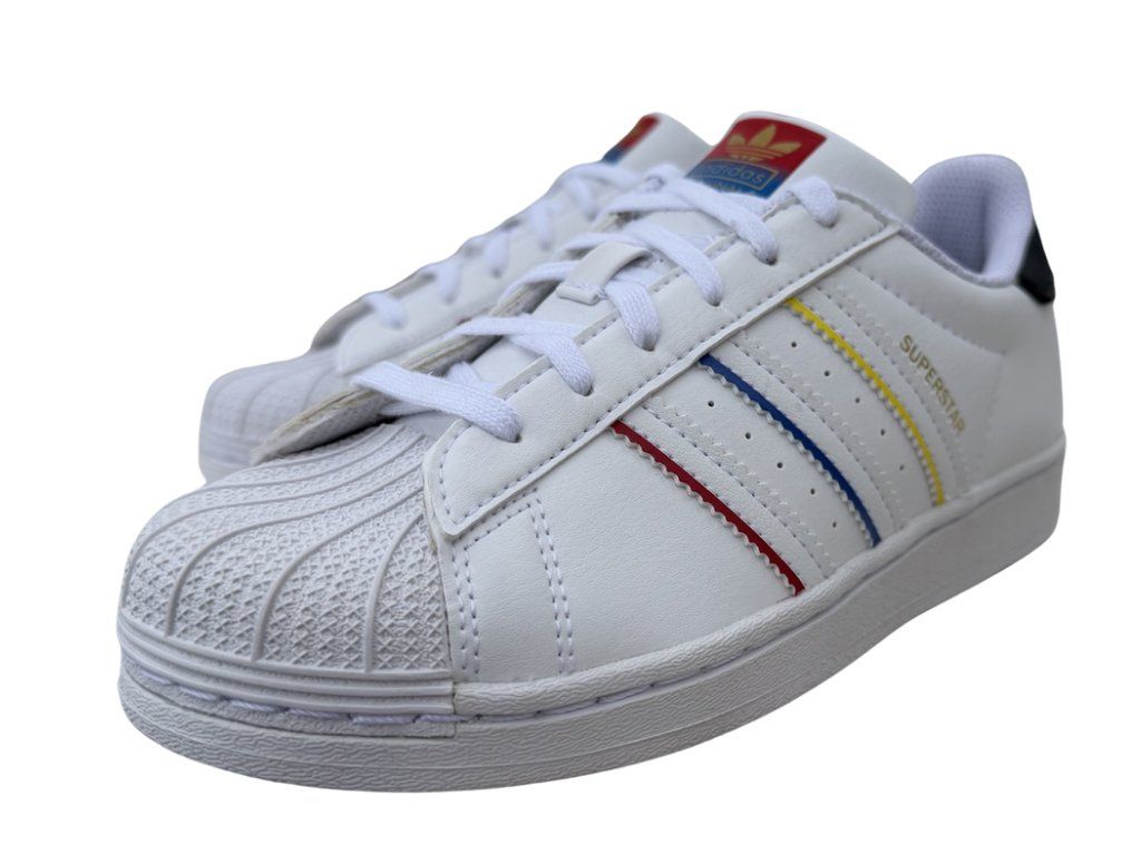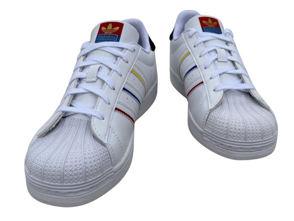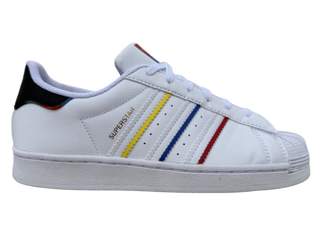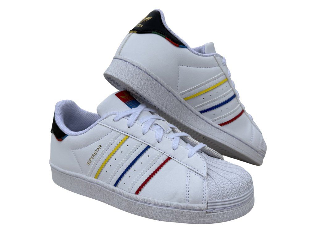 Legendární bílé tenisky, které jsou oživené hravými třemi proužky po stranách. Žlutá, modrá a červená působí svěže a skvěle doplní tyto Superstary. Gumová shell toe špička je pro model charakteristická, velmi odolná a chrání prsty. Gumová podrážka se hodí na každodenní nošení do školy i do města. Styl, který je minimalistický, ale zaujme. Podtrhnou osobitý look a skvěle se budou hodit k džínům, teplákům nebo sportovním šatům.