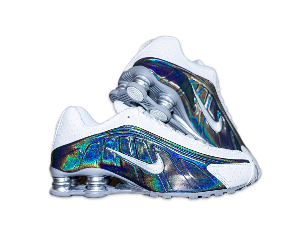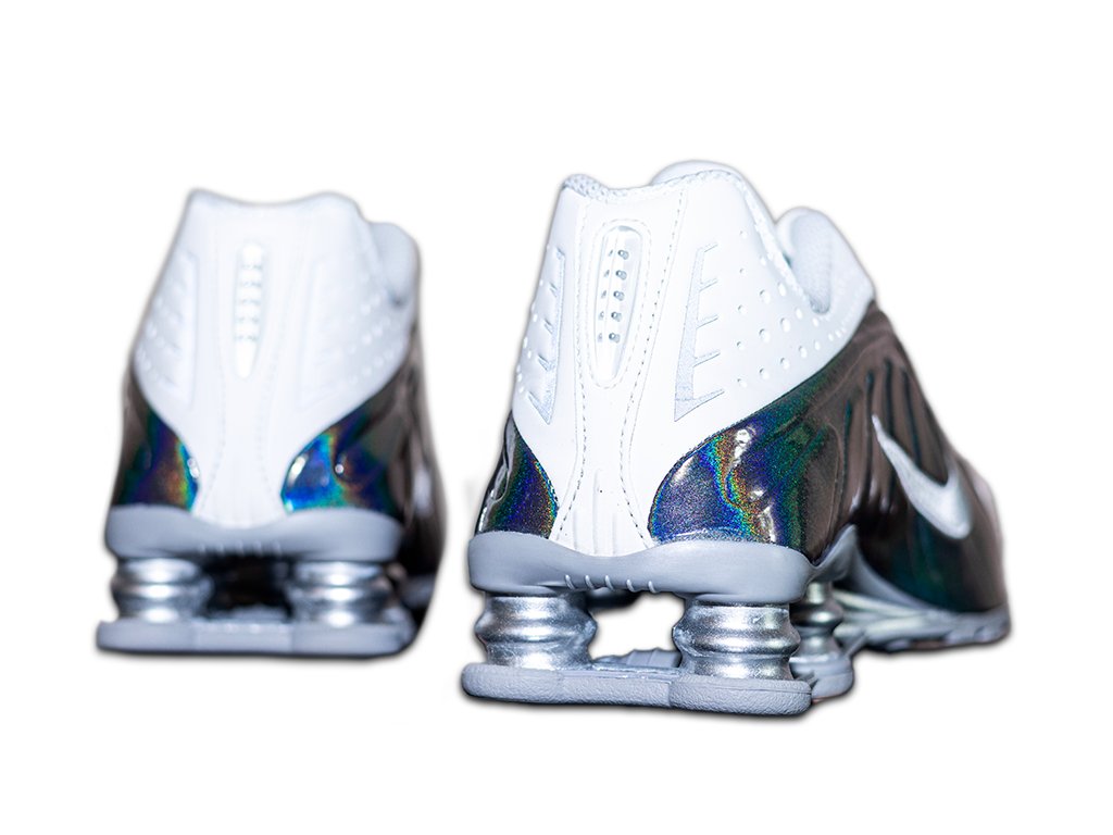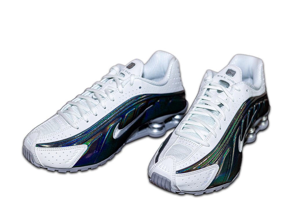Nike Shox R4 White Iridescent futuristické tenisky, které spojují design z přelomu milénia s moderním komfortem a prvky. Na první pohled přitahují pozornost díky bílému svršku, které je doplněný o měňavý metalický efekt. Ideální obuv pro všechny, kteří se nebojí vyniknout.
