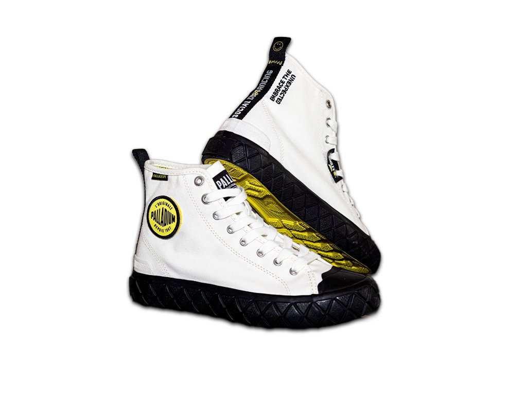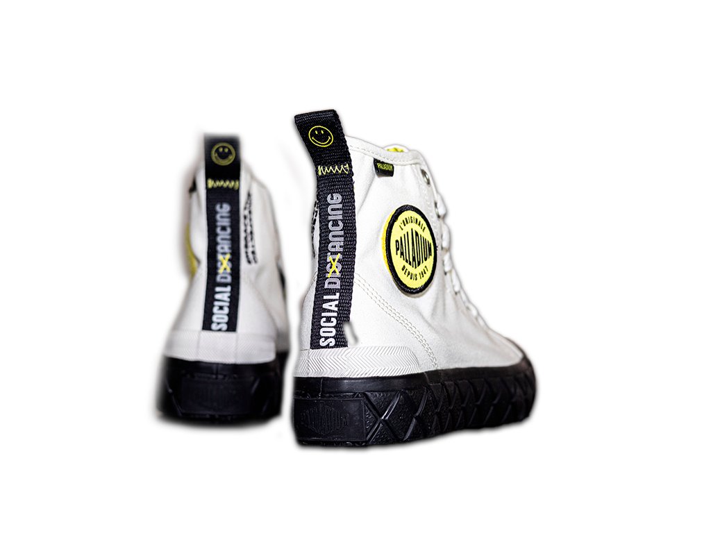 Ideální kotníkové tenisky pro městský styl se žlutými detaily v podobě "smajlíkových" koleček na boční straně. Palladium se spojilo se značkou Smiley, aby ti přineslo pozitivní energii do tvých všedních dní. S těmito teniskami se už nikdy nebudeš cítit smutně. Spojují komfort, trvanlivost a jedinečný vzhled. Svršek je vyrobený z kvalitního plátěného, bílého materiálů a je prodyšný, odolný a vhodný i do teplejších dní. Gumová černá špička a podrážka ti zajistí výbornou přilnavost a komfort při celodenním nošení. Střední střih kotníku ti poskytne podporu a praktické poutko na patě oceníš při nazouvání. Tyto tenisky sladíš jak se sportovnějším outfitem tak i lehce casual. Šiř pozitivní energii a dobrou náladu pomocí tvého obutí.