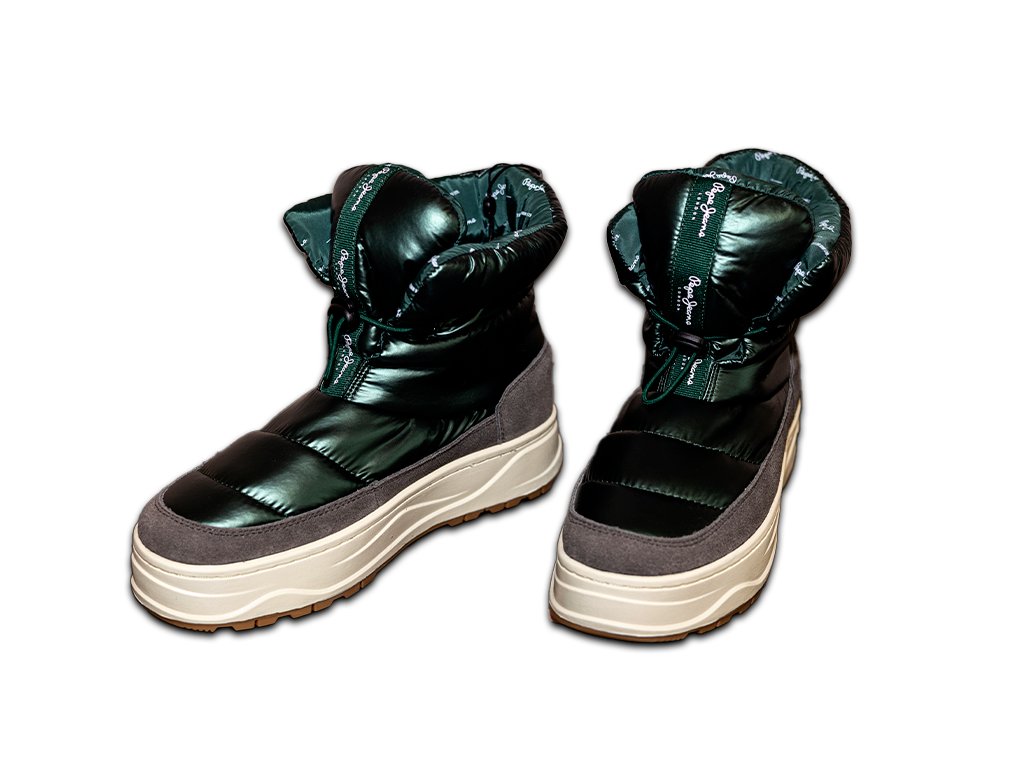 Pepe Jeans sněhule Kore Metallic Park Green jsou stylové zimní boty, které kombinují pohodlí, teplo a moderní vzhled. Jejich metalický tmavě zelený vršek dodává nevšední look každému outfitu. Vnitřní kožíšek zajistí aby noha byla v teple i když teploty padají hluboko pod bod mrazu.